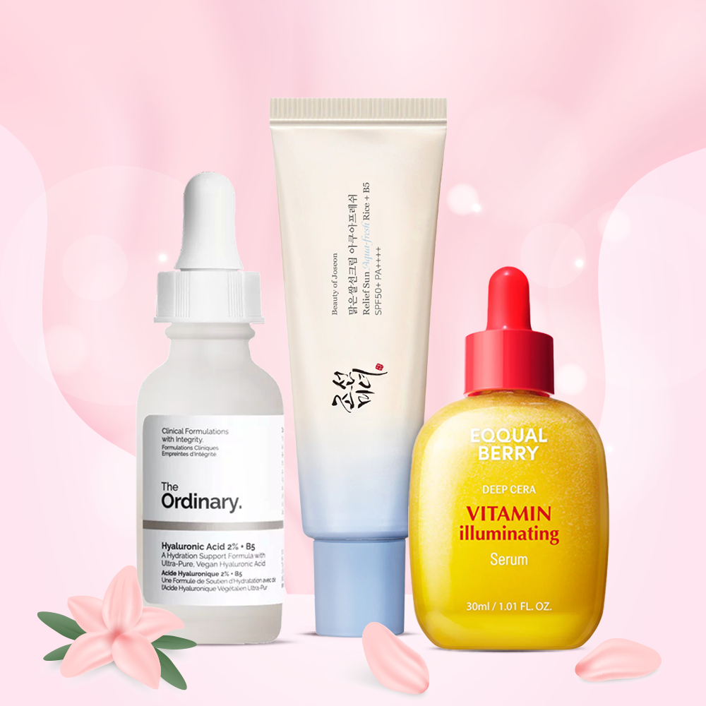روتين يومي للعناية بالبشرة : سيروم هيالورونيك اسيد اورديناري + سيروم تفتيح البشرة ايكول بيري + واقي شمس اكوا فريش بيوتي اوف جوسيون